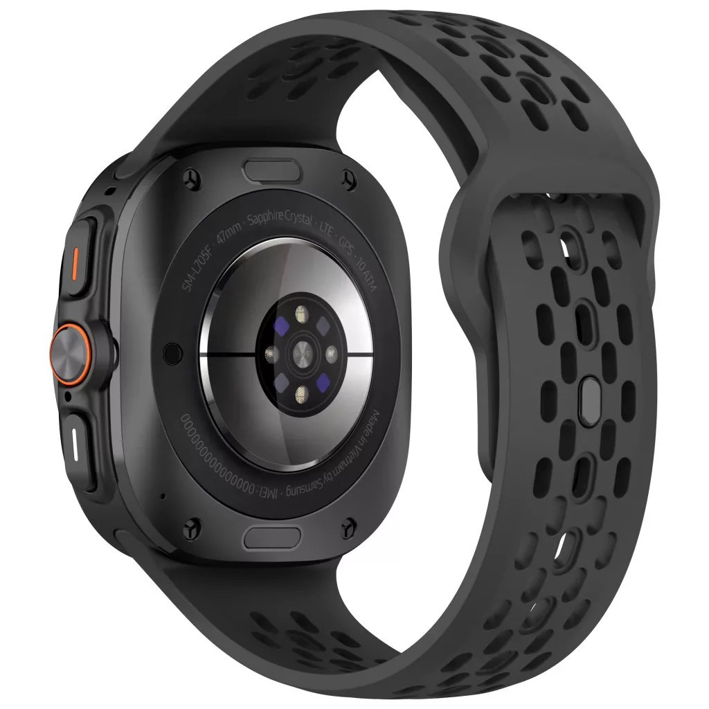 Ez a lélegző szilikon óraszíj a Samsung Galaxy Watch Ultra okosórához tervezett tartozék, amelyet funkcionalitás és kényelem ötvözésével készítettek. A perforált dizájn lehetővé teszi a megfelelő szellőzést, így a bőr alatt minimálisra csökkenti a nedvesség és hő felhalmozódását, különösen sportolás közben. Az óraszíj puha, bőrbarát szilikonból készült, amely rugalmas, de rendkívül tartós is, hosszú élettartamot biztosítva még intenzív használat mellett is.