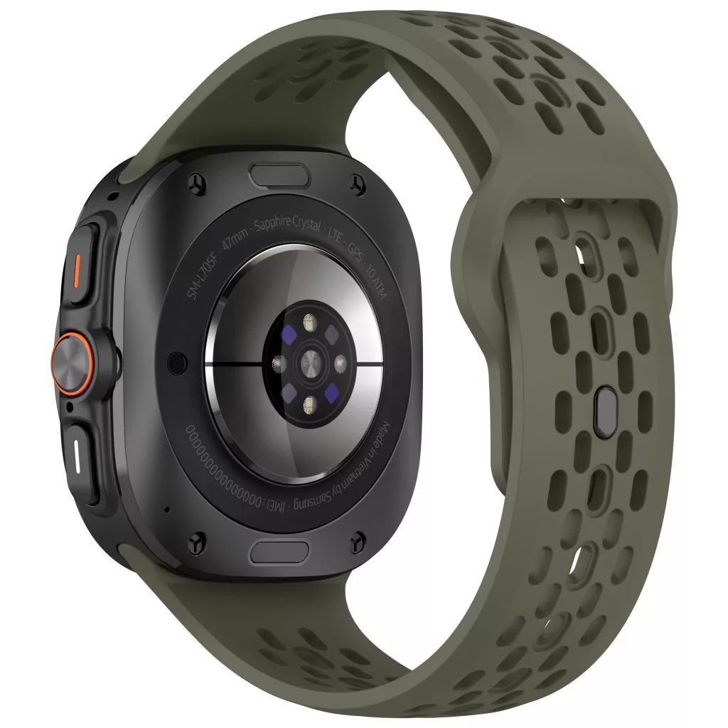 Lélegző szilikon óraszíj a Samsung Galaxy Watch Ultra készülékhez: perforált dizájn és maximális szellőzés az aktív életmódhoz tervezve.